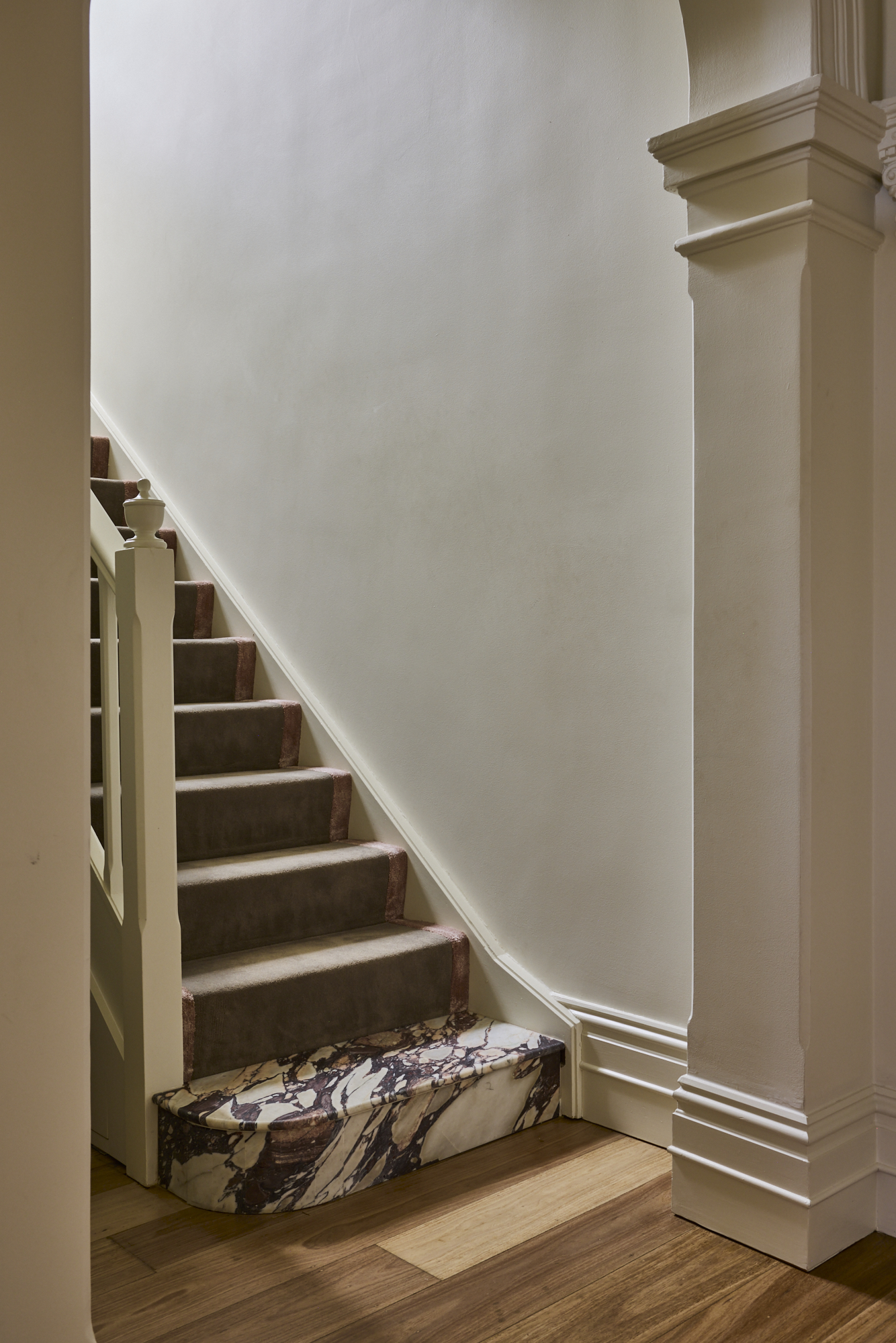 For the children’s bedrooms upstairs, SNB’s French Vanilla Marble sits ‘silently as the choice for the drawer bank’ with ‘beautiful bespoke joinery made’ specifically. The softness of the marble harmonises with a ‘selection of busy prints for the upholstery, blinds, accessories’ — and a wallpapered ceiling. This more simple choice for the girls’ bedrooms creates flexibility for their ever-evolving tastes and interests, honouring their individuality.