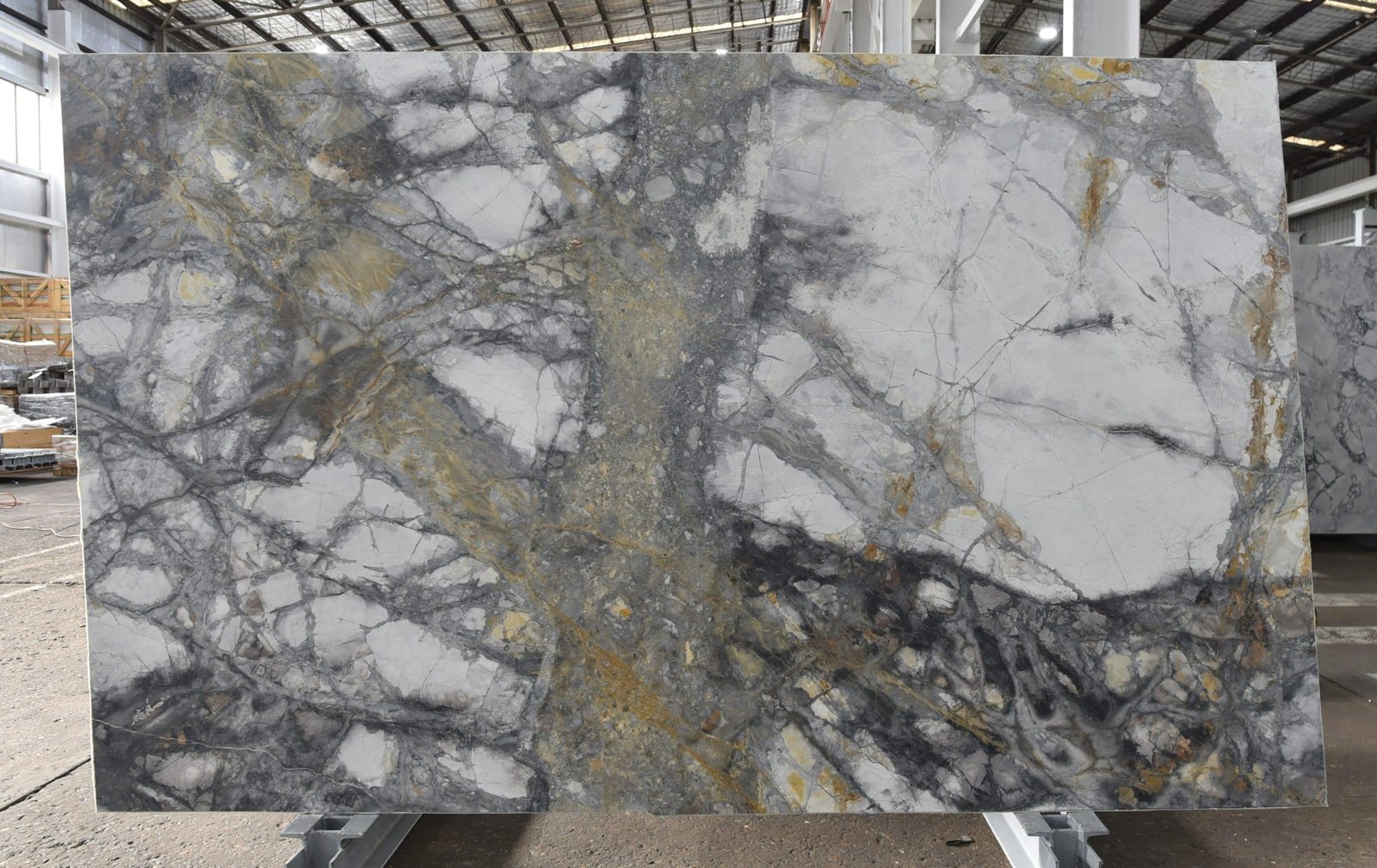 Ciel Blanc Dolomite is bold and strikingly beautiful. Featuring bold, layered grey and gold veins on a cool white base, this stone has a certain depth to it. Harness its eye-catching quality for a statement wall, kitchen island, or bar top in a high-end, contemporary space.