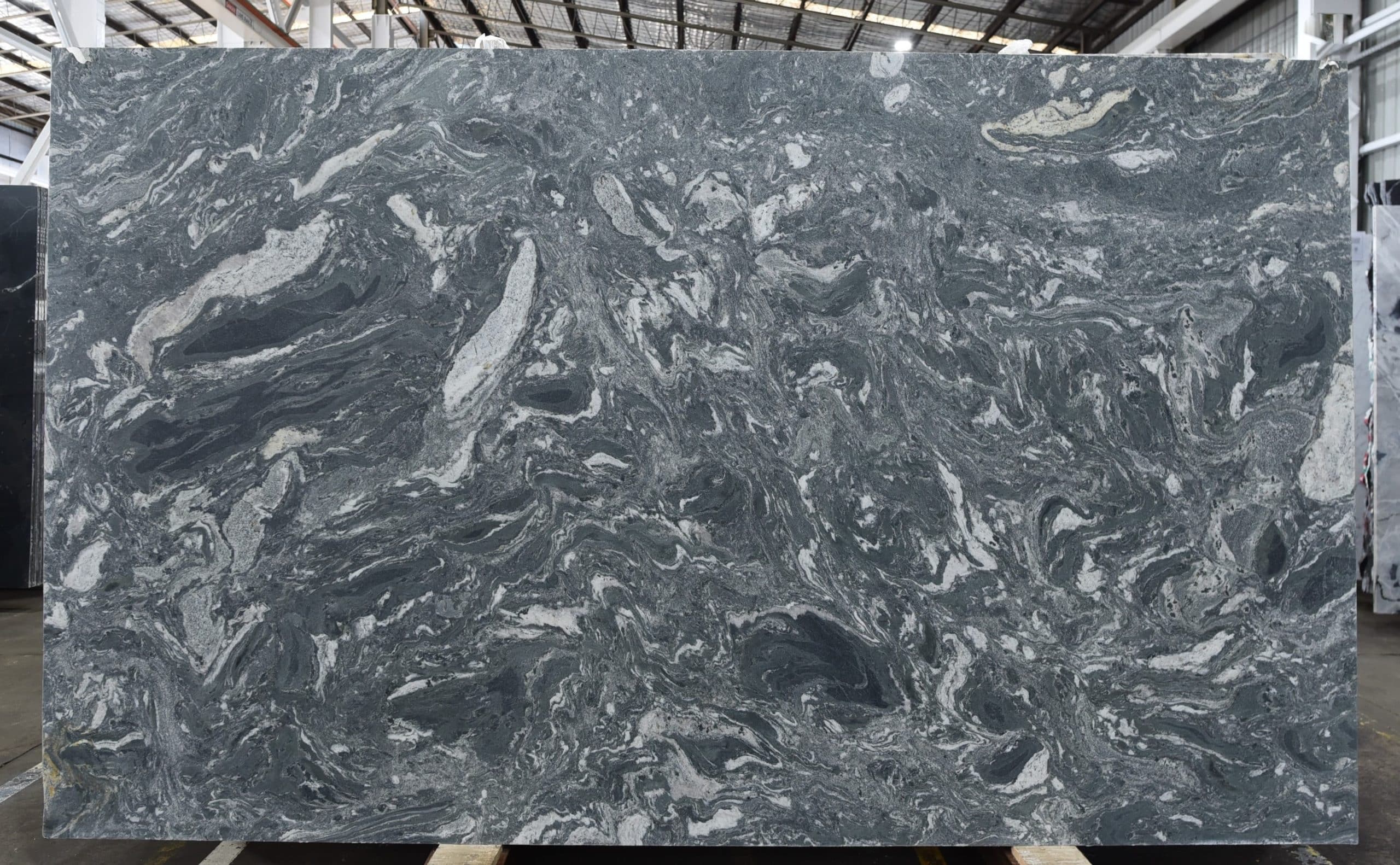 Immerse yourself in the captivating allure of Cipollino Fusion. This granite slab presents a canvas of black, adorned with undertones of soothing grey, elegantly intertwined with swirling white veins. Its distinct visual appeal enhances the sophistication of boardrooms or hotel lobbies, and at the same time, brings a touch of elegance to residential settings such as fireplace surrounds or kitchen islands. Choose Cipollino Fusion and let your spaces echo with a timeless resonance of style and elegance. Distinguished by its robustness and varied hues, granite is an embodiment of durability meeting aesthetics. Its resistance to heat, scratches, and stains makes it an enduring choice for kitchen countertops and exterior applications.