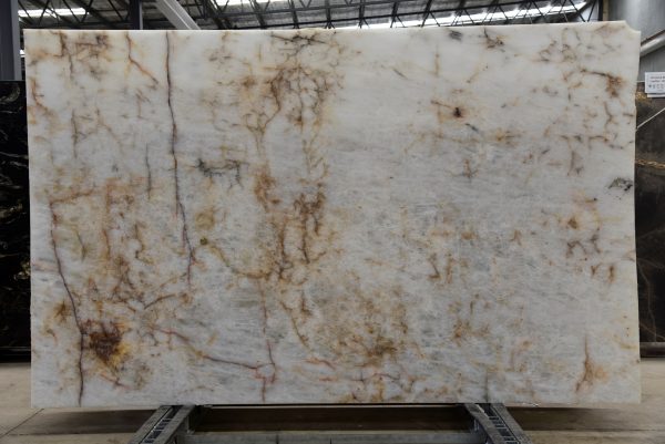 Cristallo White Quartzite is an opulent, crystalline dream. White, webbed structures make up the translucent body of this stone, interwoven with deep veins of gold and rust. A backlit feature wall allows the true nature of this Quartzite to sing. Otherwise, bring its luxury into your space as a kitchen splashback or bathroom vanity.