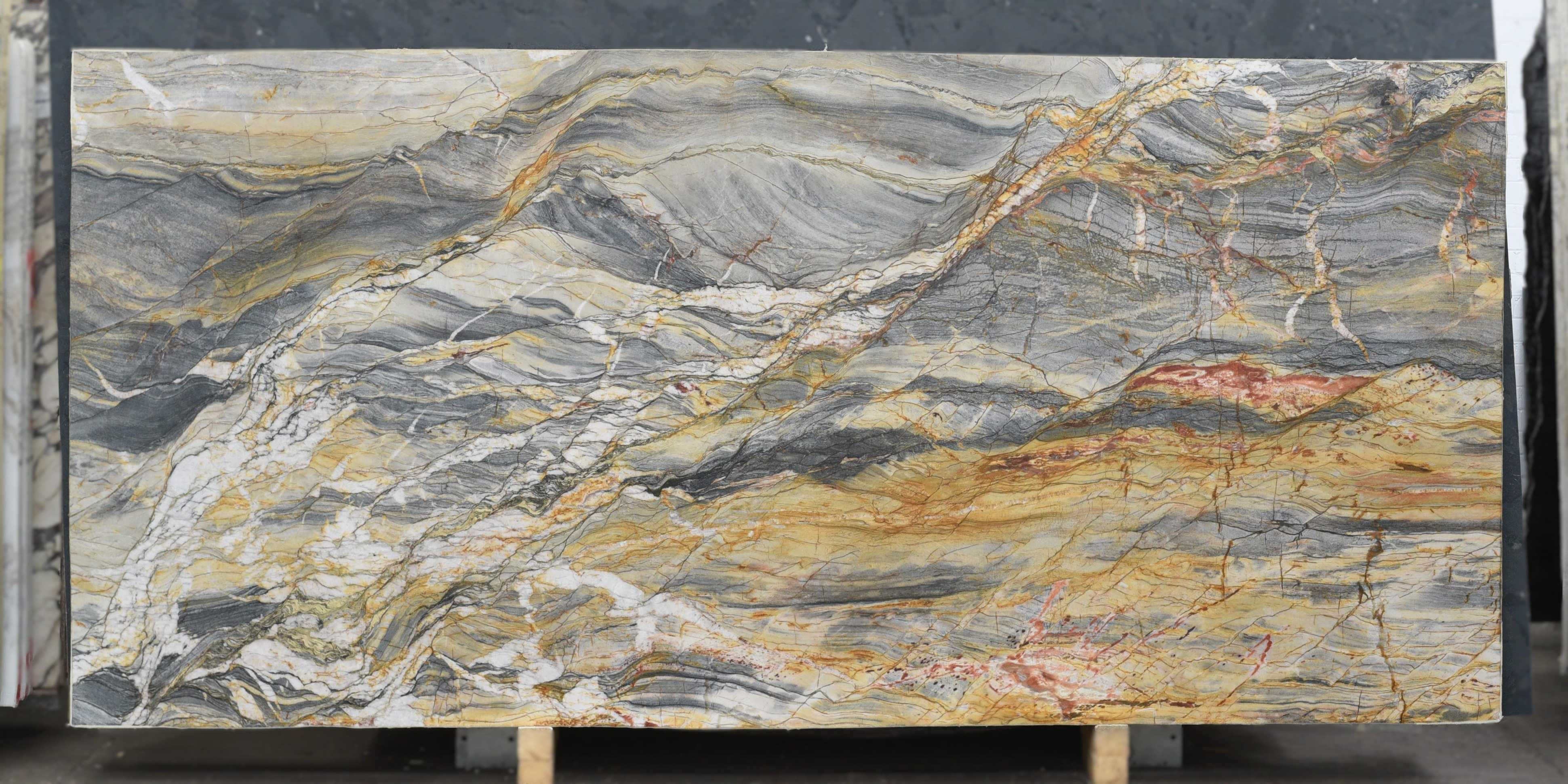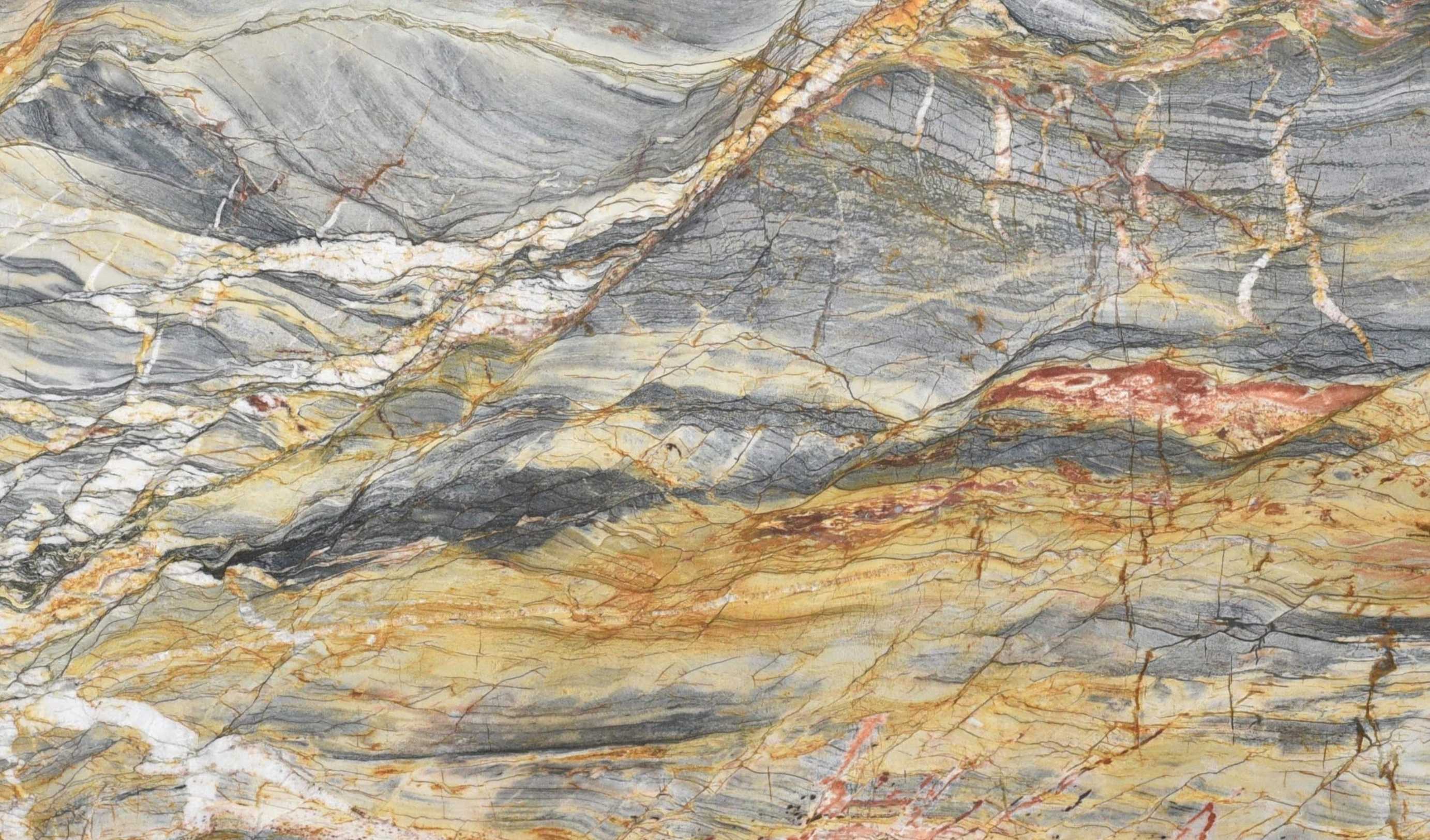 Explosion Blue, a quartzite alive with inspiration. By the attic window of the highest home on the mountain, an old painter sits in reflection. With the gestural freedom earned only through a life dedicated to capturing the natural landscape, he begins to paint with pigments from the forest and rocky range. Mustard, charcoal, terracotta sweeping in broad strokes and with the finery of a spiderweb, a layer of detail in the same hues is created with the thinnest brush he can find. He steps back to observe, both inward and outward, a world exploding. This quartzite is natures finest landscape, a perfect selection for kitchen benchtops, splashbacks, waterfall islands, or feature walls, both indoors and outdoors.
