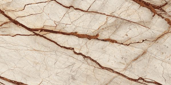 Featuring deep rivulets of rich red and shades of gold, Gold River Porcelain’s high contrast veining makes for a lush design. Over a wash of cream stone, veins link with wispy tendrils, holding the face together like kintsugi. Your tastemaking bathroom vanity or entryway benchtop could be a perfect home for this porcelain addition.