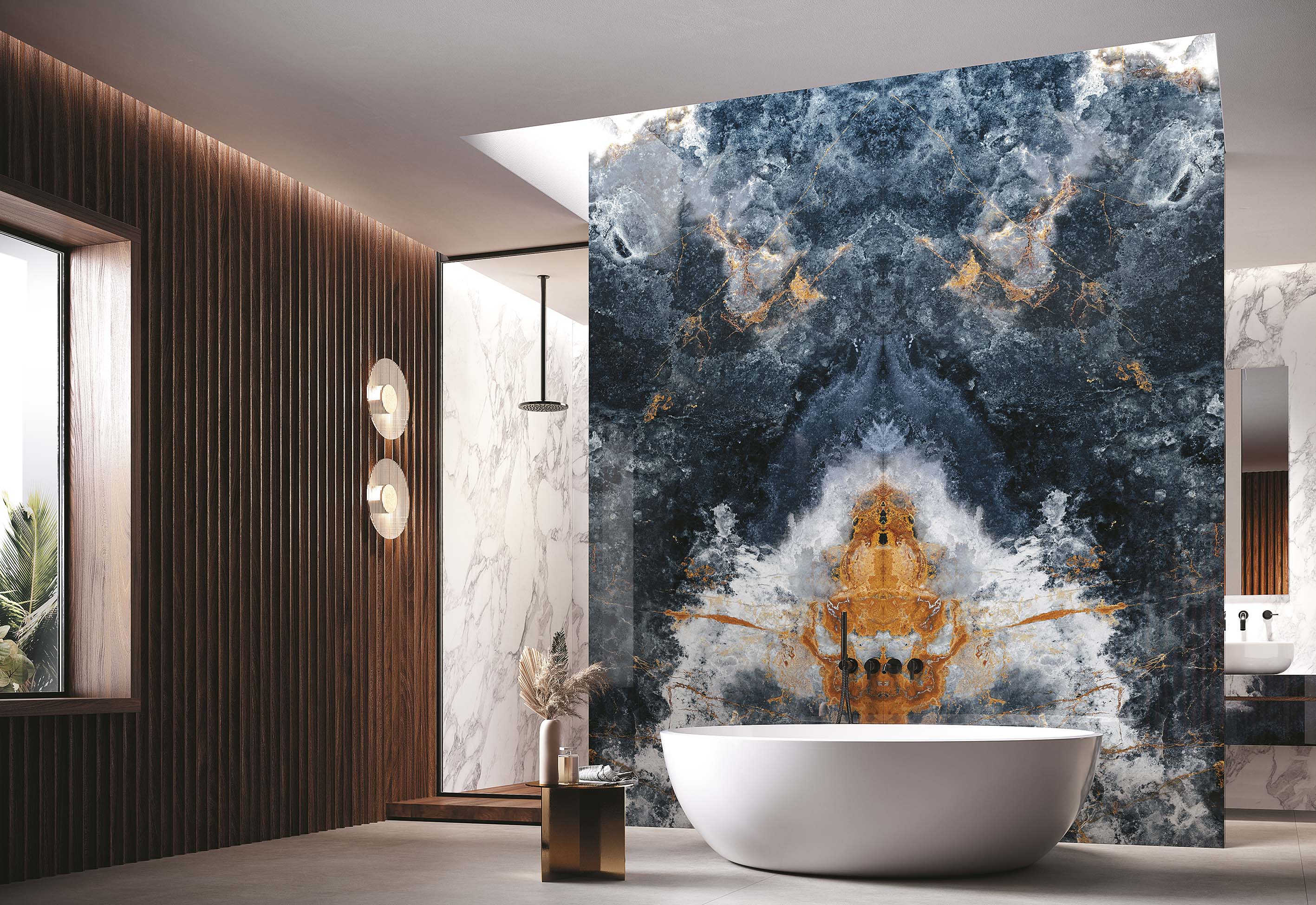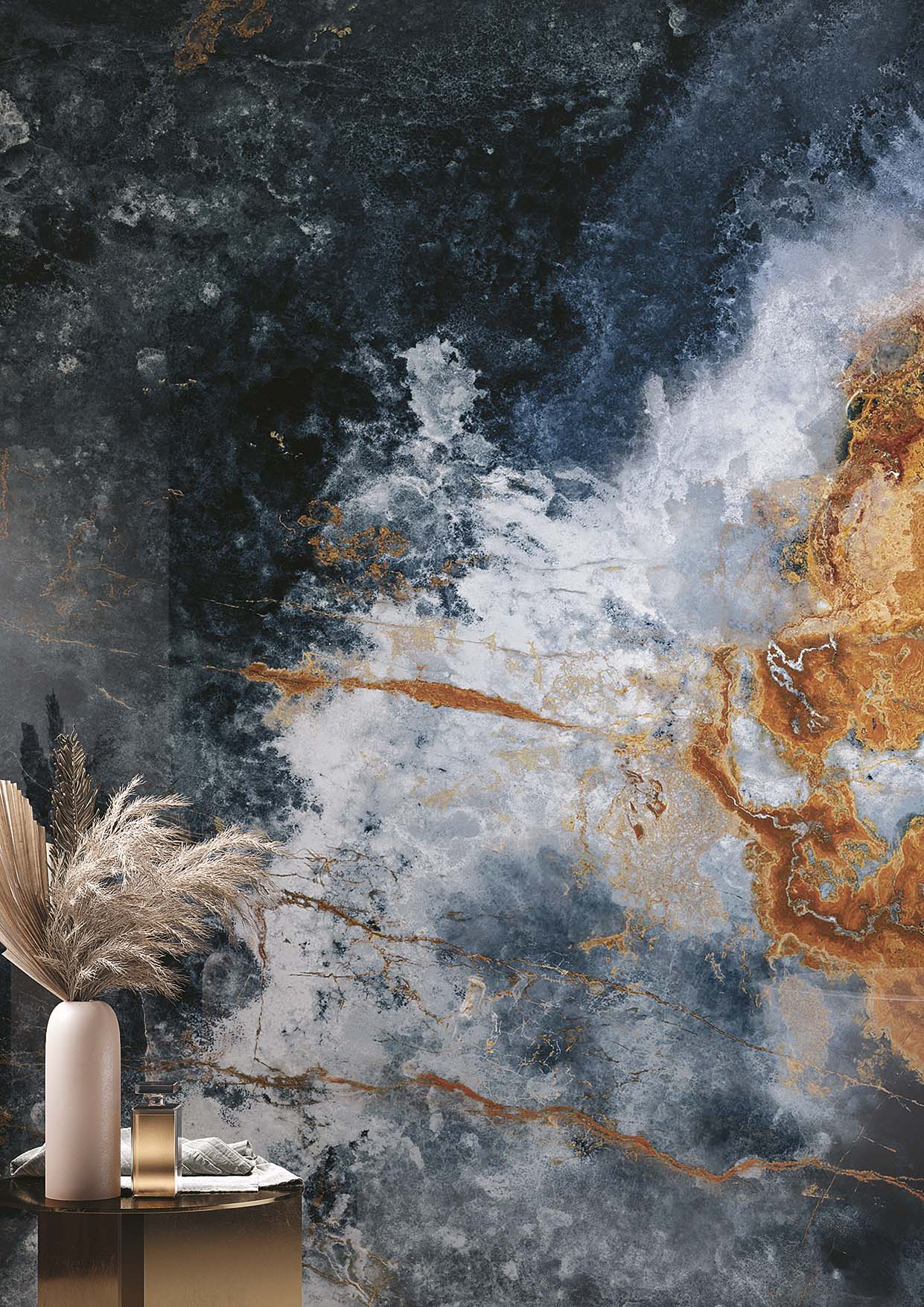 Infinity Ocean Blue Porcelain is a seaside dream. Featuring deep, swirling blues, foamy whites, and sandy browns, this material is an abstract coastal scene. A poolside feature wall or countertop are good homes for this Porcelain.