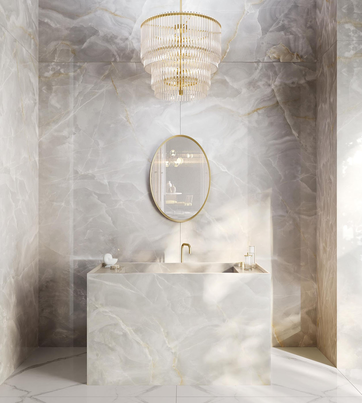 There’s a depth to the pearlescent Infinity Onyx White that evokes peace and contemplation. The transparencies of creams and greys sliced with gold and opaque white, echo the natural beauty of backlit marble on this porcelain canvas. For a clean, effortless look as a benchtop or wall cladding, remember Infinity Onyx White Porcelain for your next design project