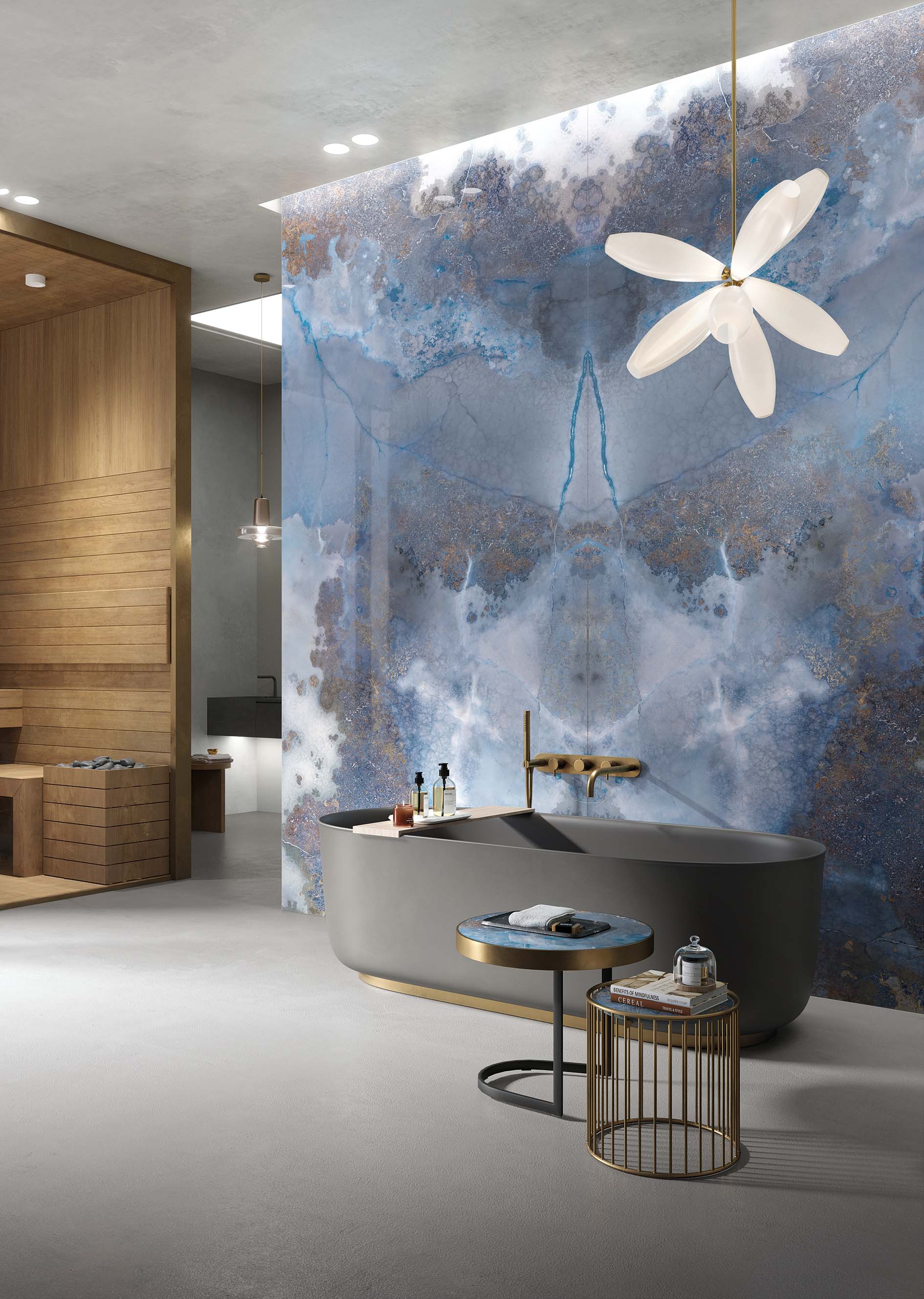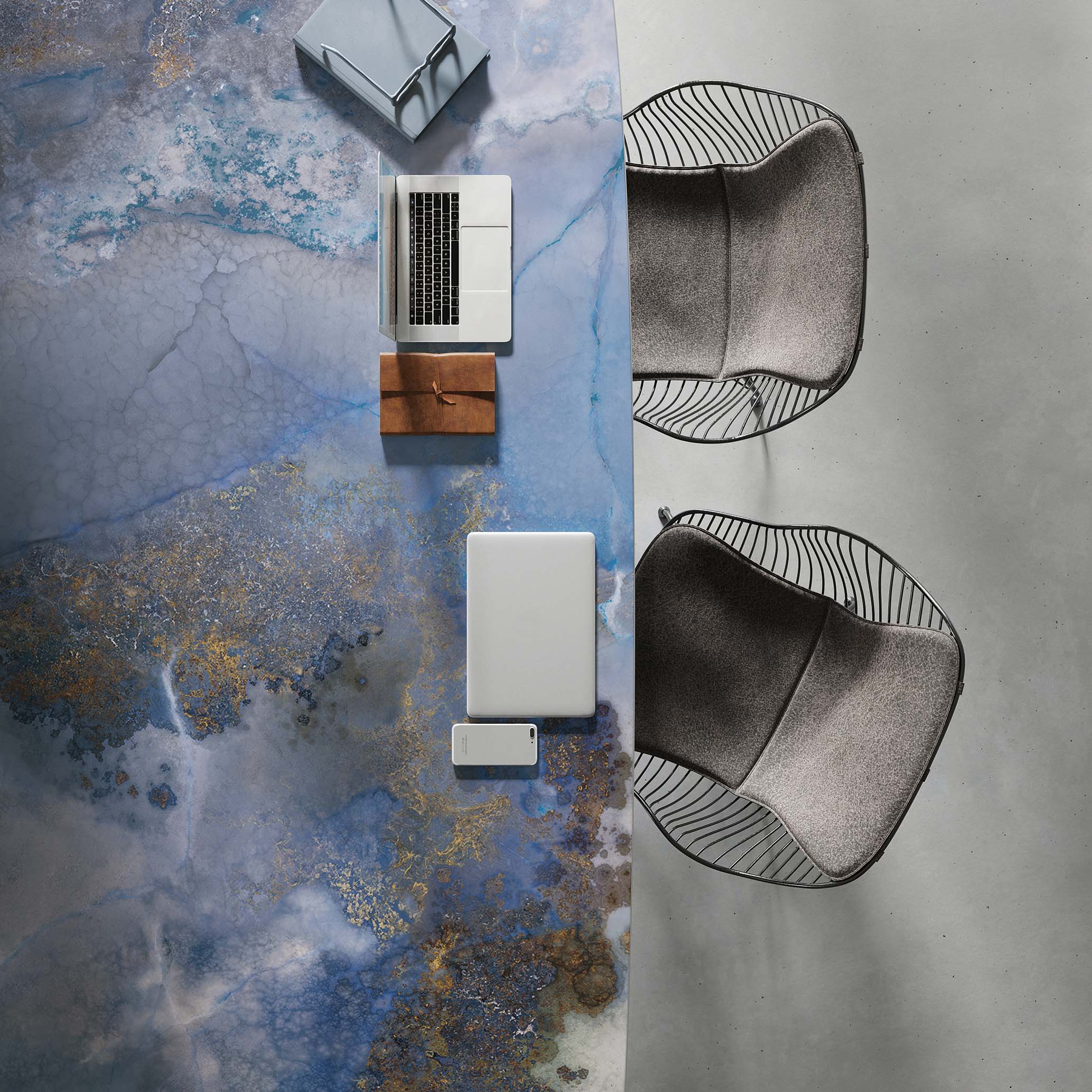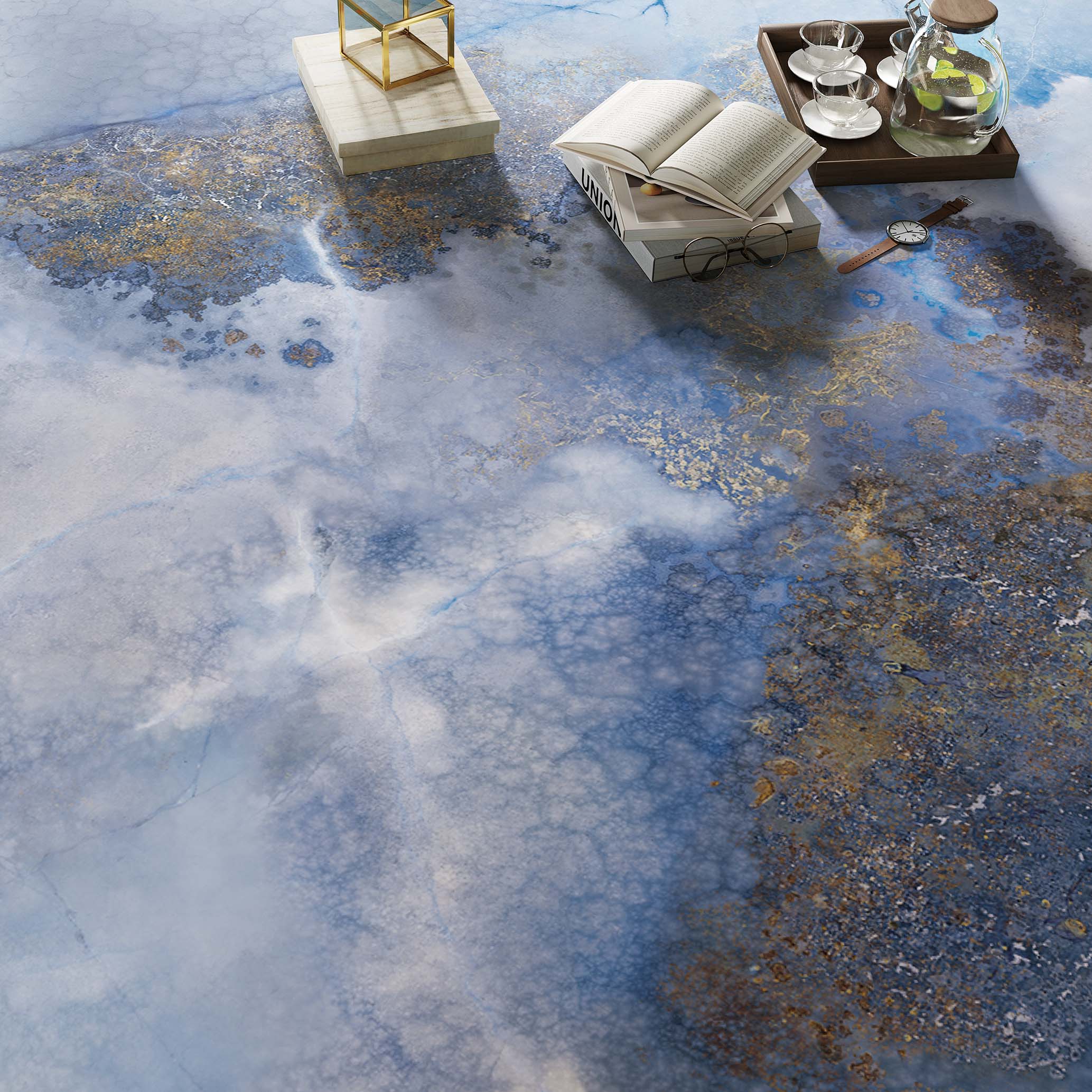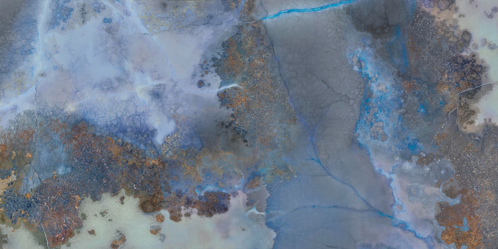 Infinity Thunderstorm Porcelain has dramatic beauty. A hazy cloud grey with rusty brown inclusions, a crackling electric blue runs through this material like lightning. An interior feature wall, splashback, or bathroom vanity are good homes for this Porcelain.