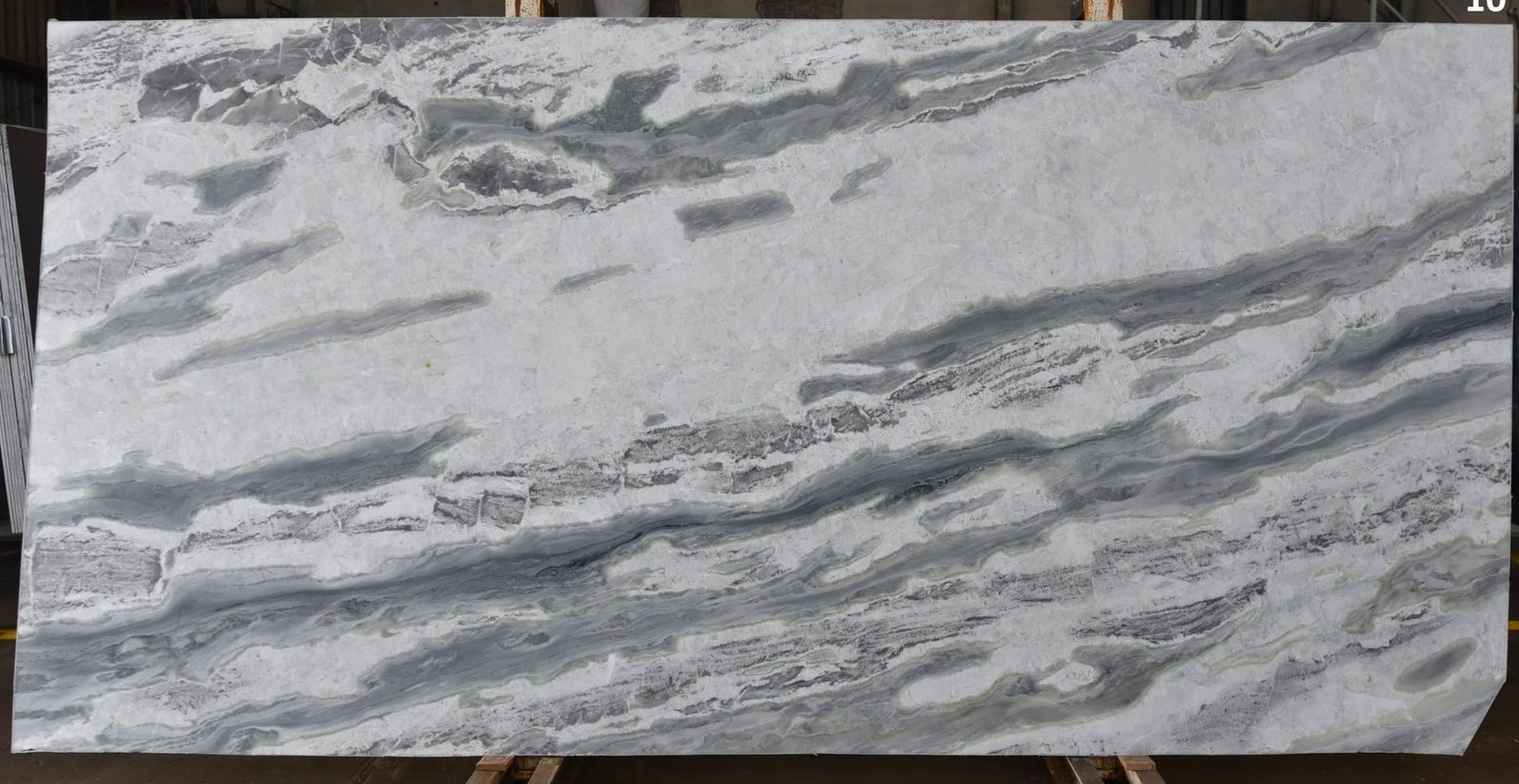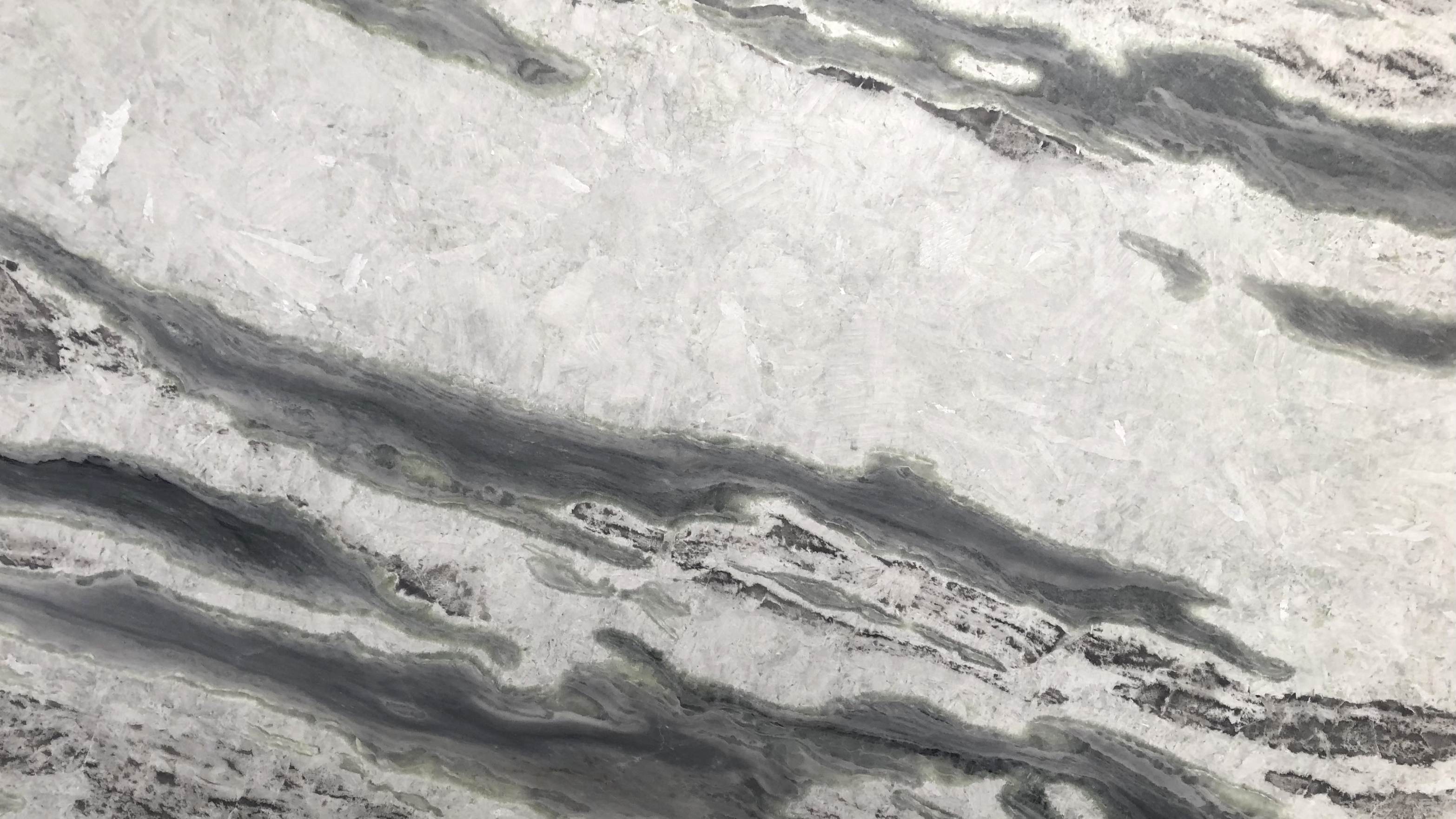 Sovereign White Quartzite has a delicate, inky feel. Against a gentle grey background, swathes of soft, grey-blue veining sweep across blockier, angular inclusions. The overall effect is reminiscent of a Japanese woodblock print. A kitchen island, splashback, or bathroom vanity are excellent uses of this stone.