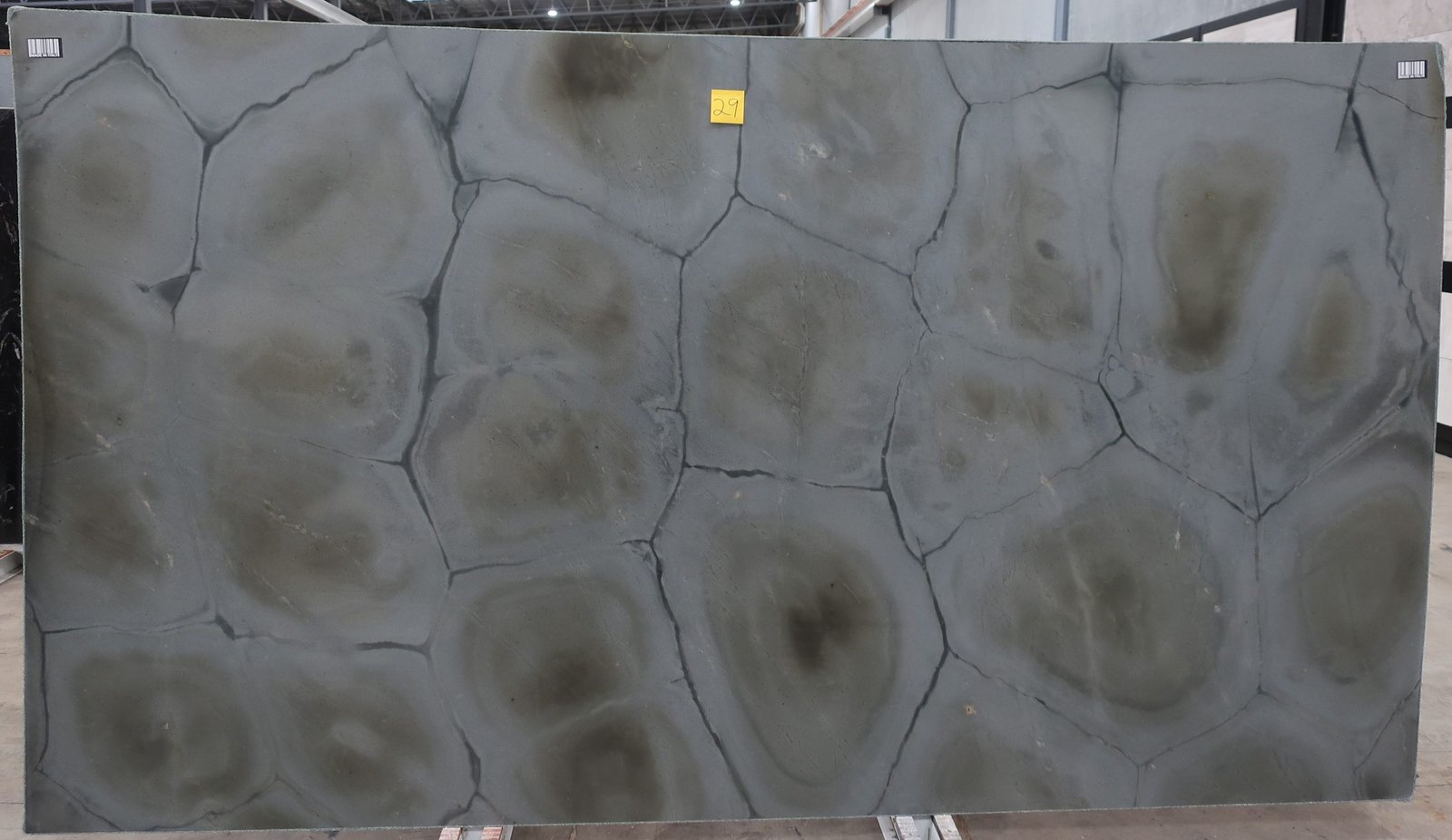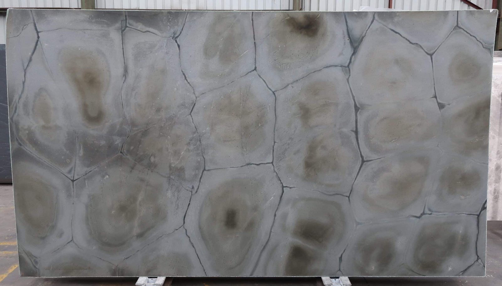 Zante Quartzite has an abstract, tortoiseshell look. Its surface broken up into sheets by thick dark veins, each scale-like section contains concentric circles of green and brown against a pale grey background. Bring this unique stone into your space as an interior or exterior feature wall, kitchen splashback, or benchtop.