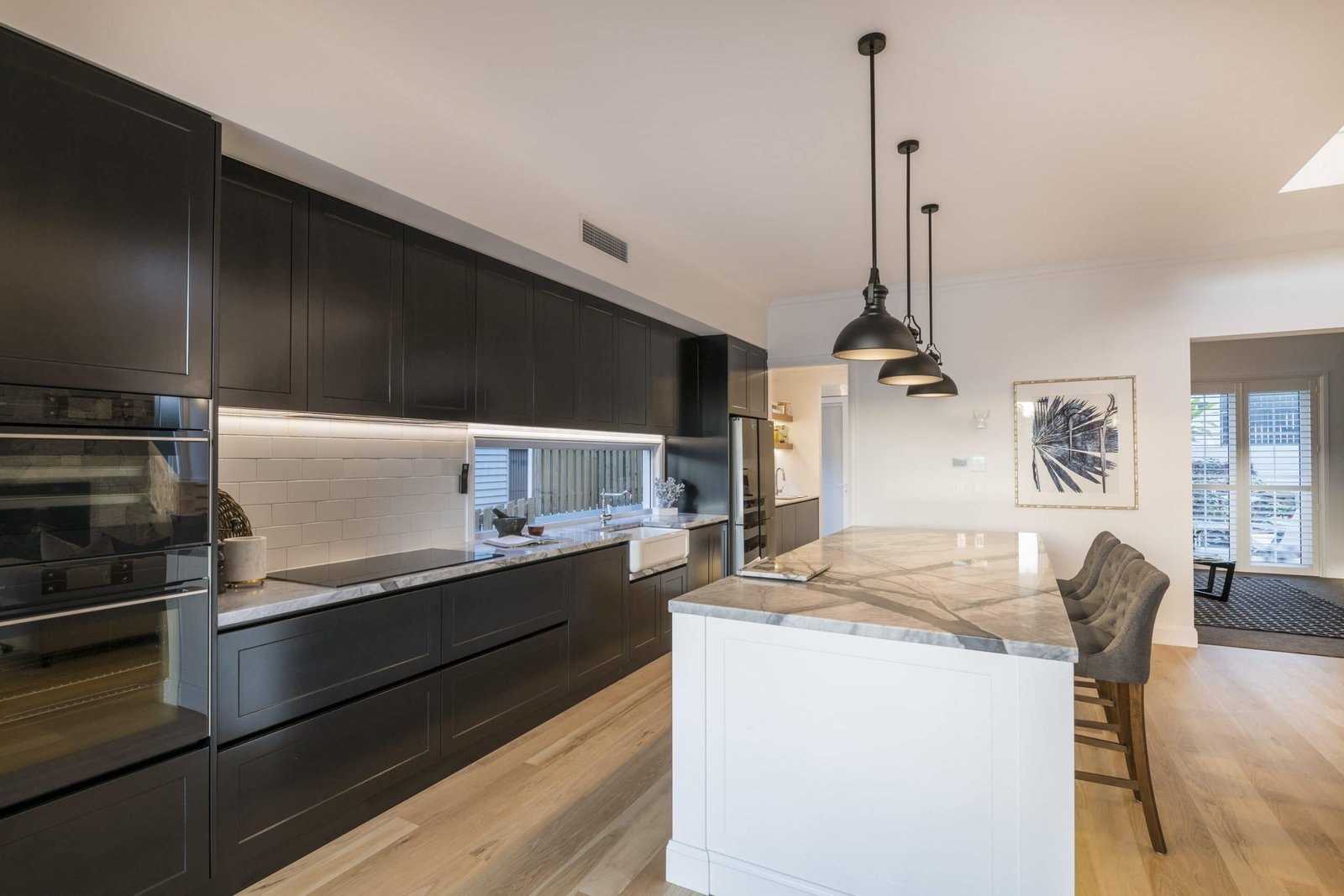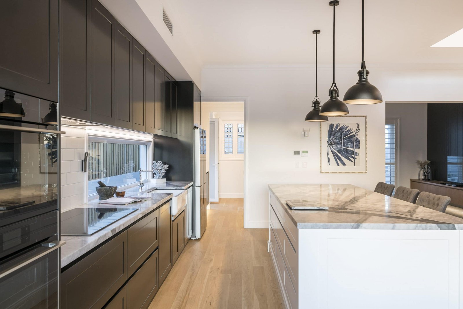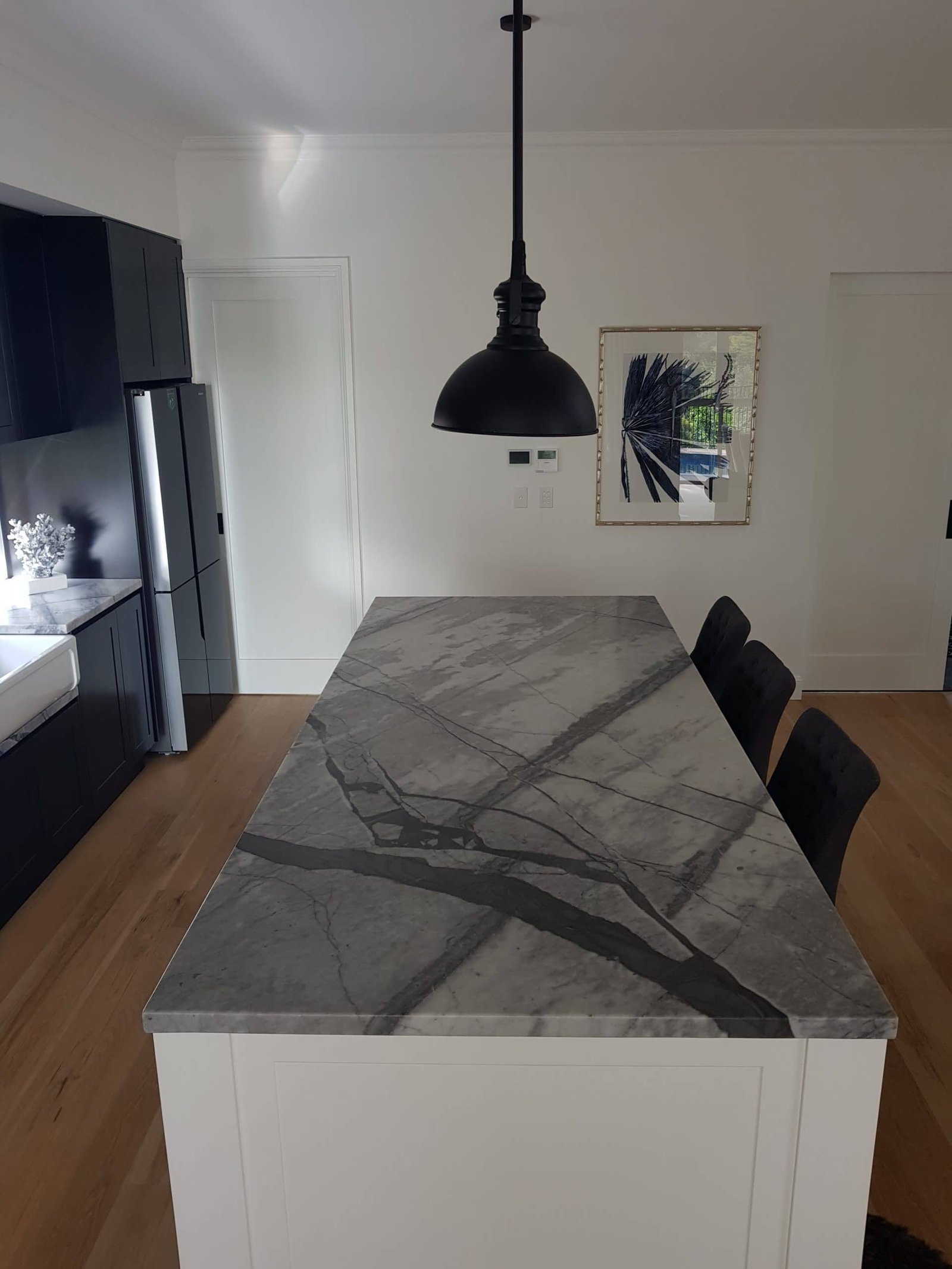 Located in Morningside, Brisbane, we see this stunning application of Bianco Venato Marble in a project completed by Space Constructions. Its white and grey tones couple perfectly to highlight the statement veining coming across the island. Following the greyscale theme, the designer implemented charcoal cabinetry without fittings, keeping the clean, minimalist look. This contemporary palette and sleek appliance selections ensure that the kitchen garners a cool sense of sophistication.